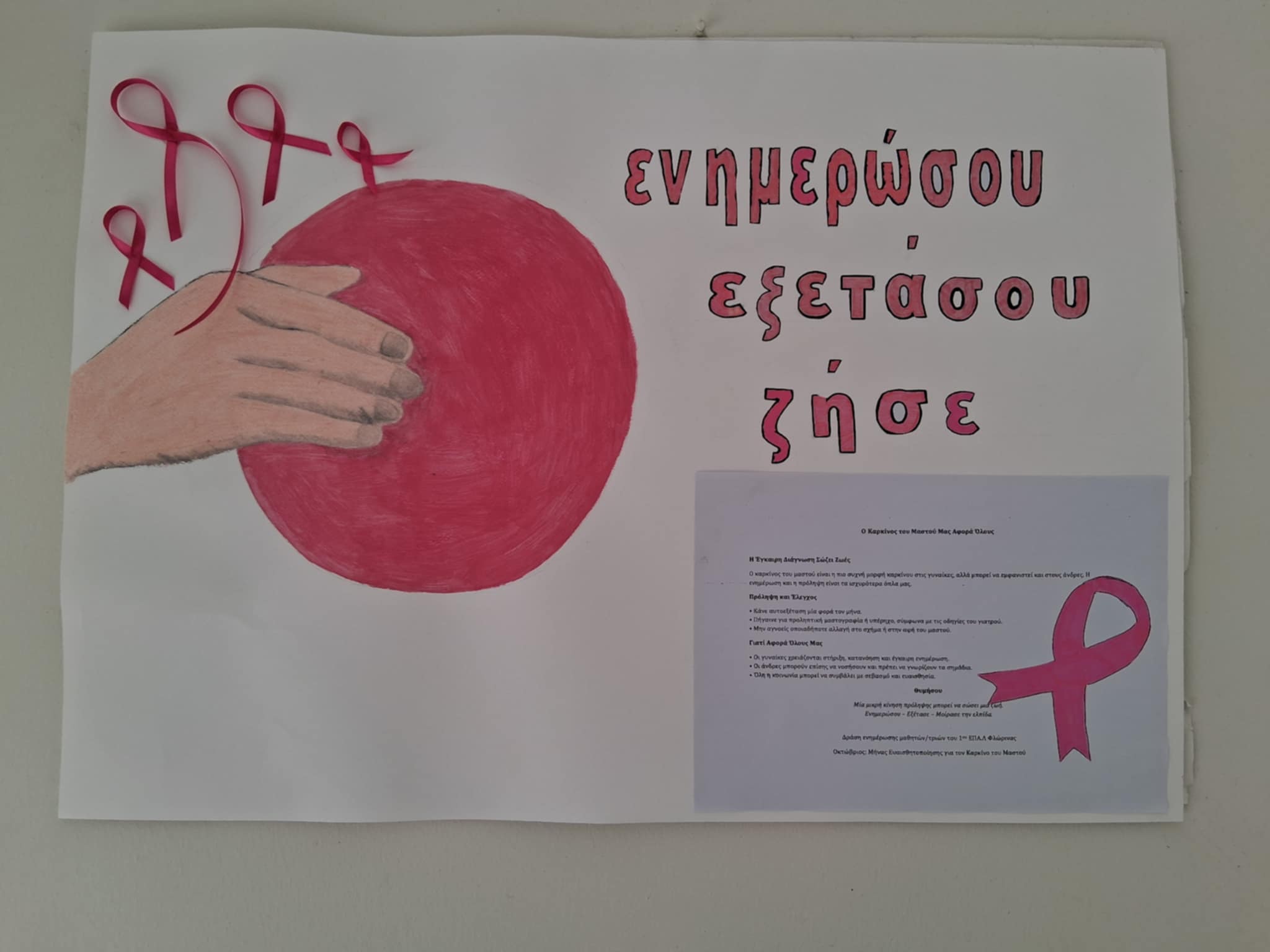 Σήμερα, Τετάρτη 22 Οκτωβρίου 2025, οι μαθήτριες του Τομέα Υγείας της Β’ τάξης, τμήμα Β Υγείας 2 προχώρησαν σε μια σημαντική δράση ενημέρωσης και ευαισθητοποίησης της σχολικής κοινότητας με θέμα τον καρκίνο του μαστού, με υπεύθυνες καθηγήτριες την κ. Γαζέα Φρειδερίκη και την κ. Παπαδοπούλου Σοφία.