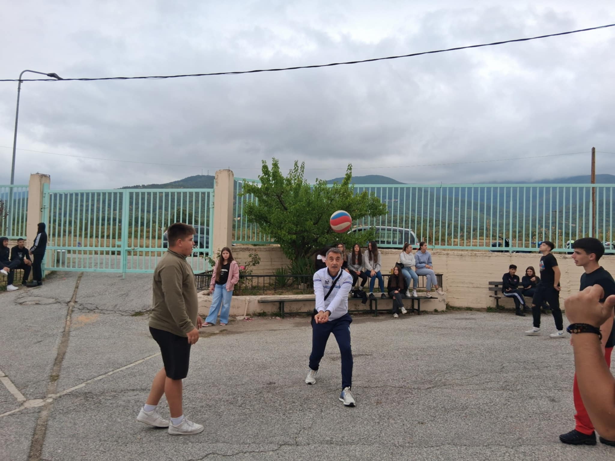Ξεχωριστή στιγμή της ημέρας αποτέλεσε η επίσκεψη του ομοσπονδιακού προπονητή της Εθνικής Ομάδας Βόλεϊ, κ. Δημήτρη Στράντζαλη, ο οποίος μίλησε στους μαθητές για τη σημασία της άσκησης, της ομαδικότητας και της προσπάθειας, ενώ στη συνέχεια έπαιξε μαζί τους βόλεϊ, προσφέροντας μοναδικές στιγμές έμπνευσης και ενθουσιασμού.