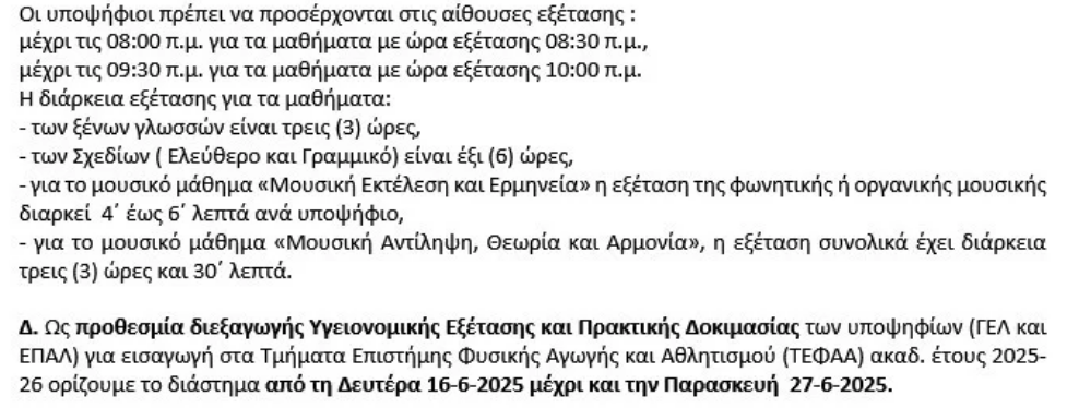 – για το μουσικό μάθημα «Μουσική Εκτέλεση και Ερμηνεία» η εξέταση της φωνητικής ή οργανικής μουσικής διαρκεί 4΄ έως 6΄ λεπτά ανά υποψήφιο,