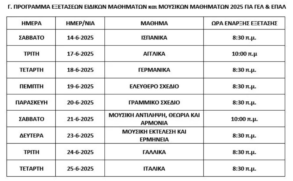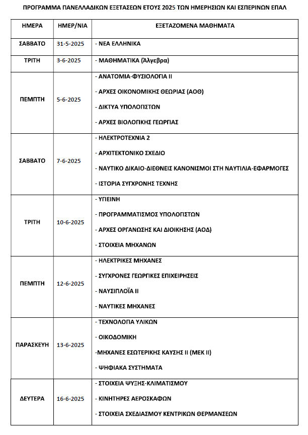 Ανακοινώθηκε από το υπουργείο Παιδείας το πρόγραμμα για τις Πανελλήνιες 2025. Όσον αφορά τα ΕΠΑΛ, οι εξετάσεις ξεκινούν το Σάββατο 31/05 και τελειώνουν τη Δευτέρα 16/06. Οι εξετάσεις στα Ειδικά και Μουσικά Μαθήματα ξεκινά στις 14/06 και ολοκληρώνονται στις 25/06.