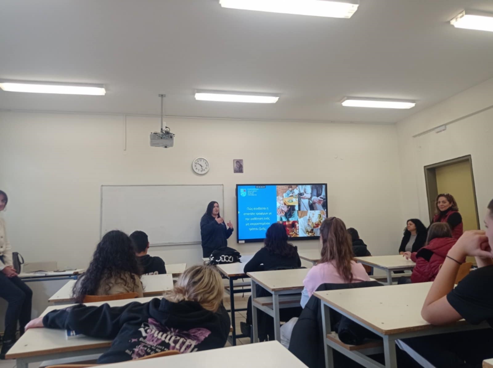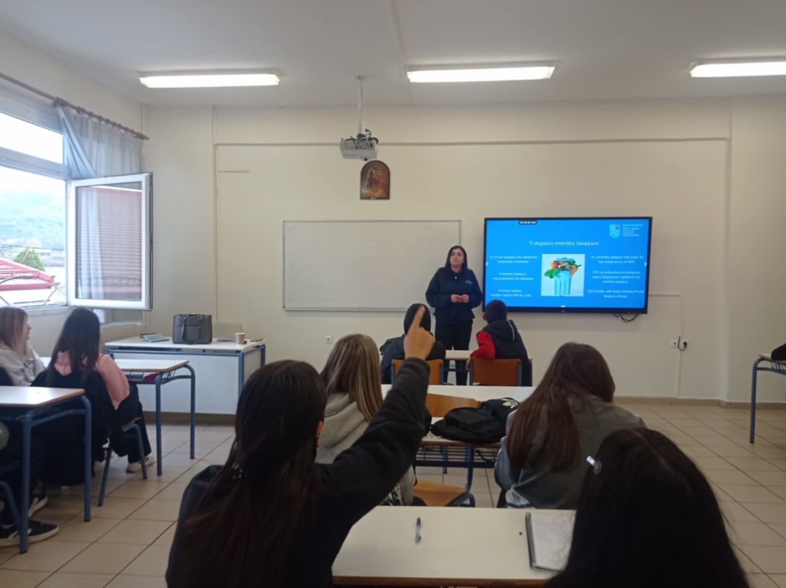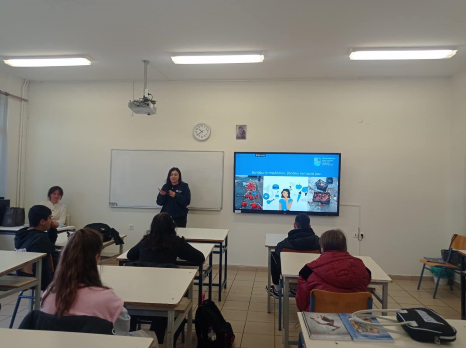 Η κ. Σταυρούλα Αντάρα, κοινωνιολόγος, μέσα από προβολή επιλεγμένου οπτικοακουστικού υλικού και ομαδική συζήτηση, βοήθησε τους μαθητές να προβληματιστούν γύρω από την αξία της ισορροπημένης και υγιεινής διατροφής. Παράλληλα, τους ενθάρρυνε να αναπτύξουν κριτική σκέψη σχετικά με τις διατροφικές τους επιλογές και τον τρόπο με τον οποίο αυτές επηρεάζουν την υγεία και το περιβάλλον.