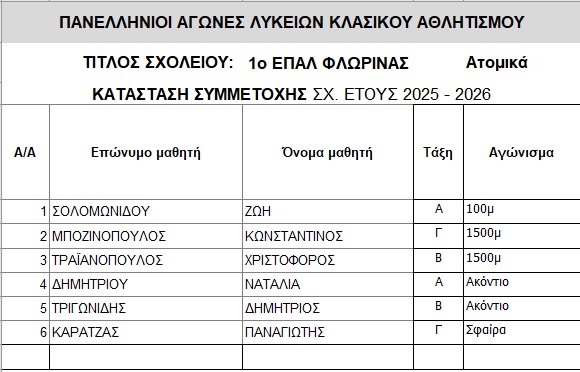 Η Σχολική κοινότητα του 1ου ΕΠΑΛ Φλώρινας συγχαίρει όλους τους μαθητές και τις μαθήτριες που συμμετείχαν στους σχολικούς αγώνες κλασικού αθλητισμού, την Παρασκευή 3 Απριλίου 2026. Παρά τις δύσκολες καιρικές συνθήκες, που δυστυχώς εμπόδισαν πολλούς μαθητές να συμμετάσχουν, όσοι συμμετείχαν εκπροσώπησαν το σχολείο μας με ήθος, ενθουσιασμό και αξιοπρέπεια. Η συμμετοχή και μόνο αποτελεί νίκη, καθώς ο αθλητισμός καλλιεργεί αξίες όπως η συνεργασία, η επιμονή και ο σεβασμός.